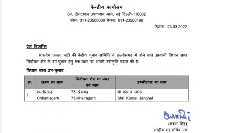 खैरागढ़ उपचुनाव के लिए भाजपा ने पूर्व विधायक कोमल जंघेल को अपना प्रत्याशी बनाया है। कोमल जंघेल पिछले चुनावों में महज 870 वोटों से चुनाव हारे थे। वहीं छत्तीसगढ़ जनता कांग्रेस जे ने स्व. देवव्रत सिंह के बहनोई नरेंद्र सोनी को अपना उम्मीदवार घोषित किया है।