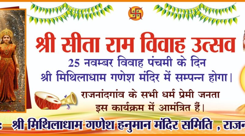 Read Moreराजनांदगांव। श्री मिथिला धाम गणेश हनुमान मंदिर में अगहन शुक्ल पंचमी यानी विवाह पंचमी पर इस वर्ष भव्य राम–जानकी विवाह