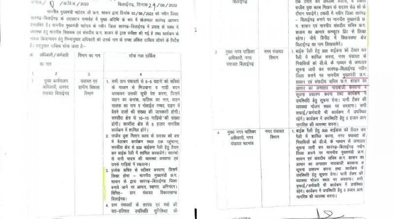 सारंगढ़-बिलाईगढ़ के नाम से बनने वाले इस जिले में बिलाईगढ़ एसडीएम का एक आदेश सुर्खियां बटोरने के साथ ही विपक्षी नेताओं के निशाने पर आ गया था। बिलाईगढ़ एसडीएम ने उक्त आदेश जारी किया था जिसमें उन्होंने कार्य विभाजन करते हुए अलग-अलग विभागों को अलग-अलग जिम्मेदारी दी थी।