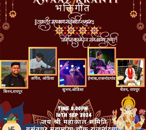 राजनांदगांव। जय श्री महाकाल समिति, बसंतपुर के तत्वधान पर बसंतपुर महामाया चौक पर दिनांक 16 सितंबर 2024, दिन-सोमवार को संगीतमय कार्यक्रम का आयोजन किया गया। यह भक्ति गीतों का कार्यक्रम जिसमें अर्पित जी ओडिसा, शुभम जी ओडिसा, किरण जी रायपुर, चेतन साथ में हेमांक साहू राजनांदगांव से कार्यक्रम की शोभा बढ़ाएंगे। समिति के सदस्यों ने सभी नगरवासियों व श्रोतागण को संध्या 8 बजे अपनी उपस्थिति दर्ज करा कर युवा कलाकारों का उत्ससाहवर्धन करने की अपील की है।