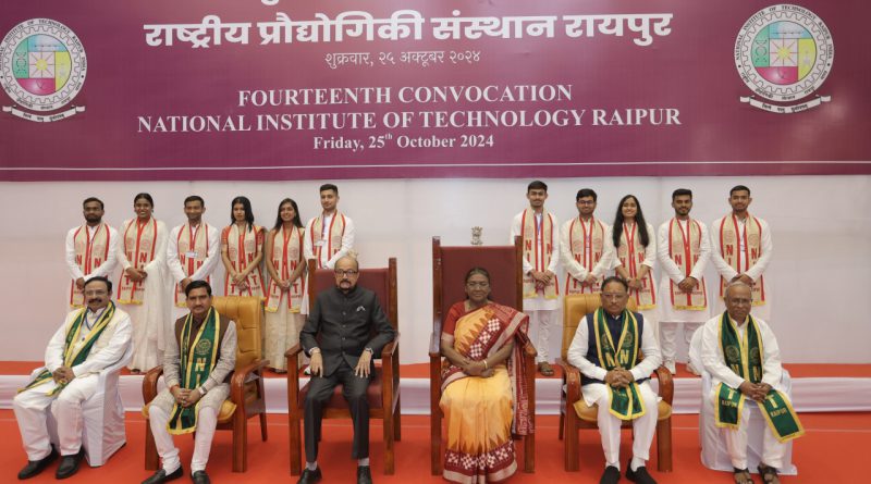 रायपुर। राष्ट्रीय प्रौद्योगिकी संस्थान, रायपुर के लिए आज 25 अक्टूबर का दिन ऐतिहासिक रहा। देश की राष्ट्रपति श्रीमती द्रौपदी मुर्मु ने आज संस्थान के 14वें दीक्षांत समारोह में अपनी गरिमामय मौजूदगी दी और 12 होनहार विद्यार्थियों को उनकी बेहतरीन शैक्षणिक उपलब्धियों के लिए अपने हाथों से स्वर्ण पदक प्रदान किया। राज्यपाल श्री रमेन डेका, मुख्यमंत्री श्री विष्णु देव साय और केन्द्रीय राज्य मंत्री श्री तोखन साहू भी दीक्षांत समारोह में विशिष्ट अतिथि के रूप में शामिल हुए।