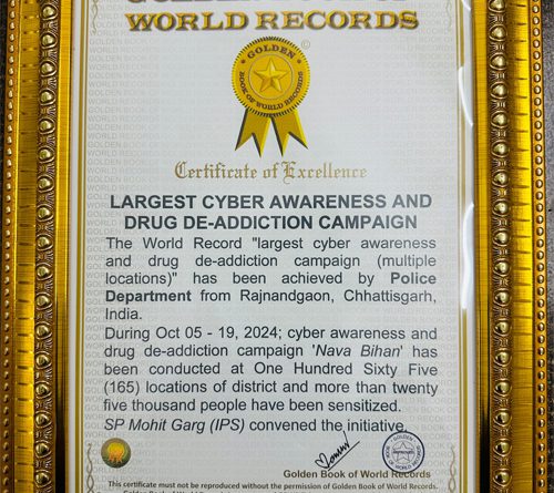 राजनांदगांव पुलिस को डाटा वेरिफिकेशन पश्चात मिला गोल्डन बुक ऑफ वर्ल्ड रिकार्ड्स सर्टिफिकेट