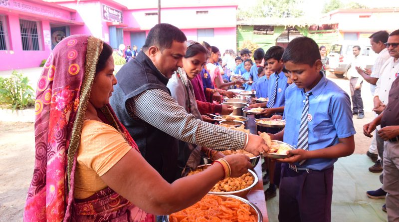 न्योता भोजन में बच्चों ने गरमा-गरम जलेबी, भजिया, बर्फी, पूड़ी एवं सुरूचिपूर्ण भोजन का लिया आनंद
