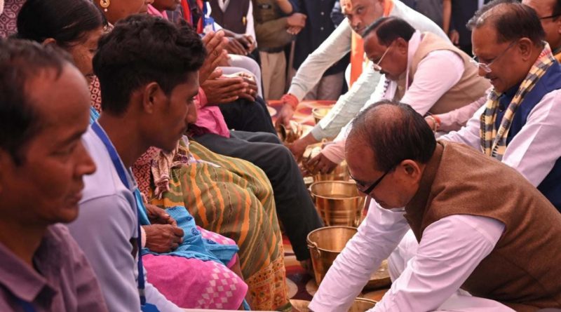 आवास योजना के लाभार्थियों का पांव पखार कर केंद्रीय मंत्री शिवराज चौहान और मुख्यमंत्री साय ने किया अभिनंदन