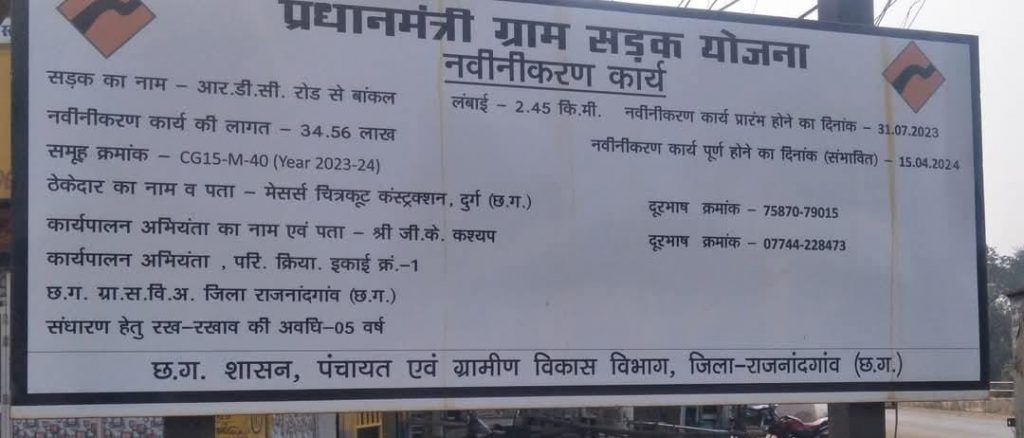 आरडीसी रोड़ से बाँकल जाने वाली इस सड़क के नवीनीकरण कार्य के लिए 34.56 लाख रूपए स्वीकृत किए गए थे. यह कार्य मेसर्स चित्रकूट कँस्ट्रक्शन दुर्ग के जिम्मे था.पँचायत एवं ग्रामीण विकास विभाग की राजनांदगाँव की परियोजना क्रियान्वयन इकाई क्रमांक एक के अधीन यह कार्य आता है.