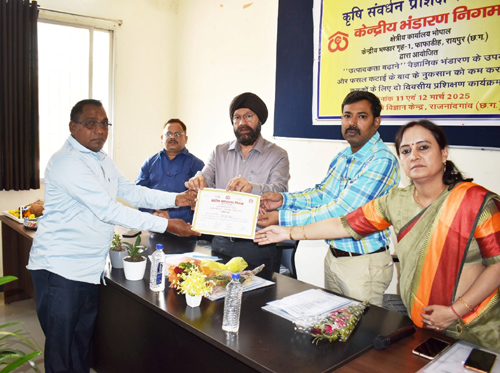 निदेशक विस्तार सेवाएं इन्दिरा गाँधी कृषि विश्वविद्यालय रायपुर डॉ. एसएस टूटेजा के मुख्य आतिथ्य में प्रशिक्षण कार्यक्रम के द्वितीय दिवस में कृषकों के उत्पादकता में वृद्धि एवं भंडारण की वैज्ञानिक जानकारी प्रदान की गई। शाखा प्रबन्धक राज्य भंडारण निगम सूर्यकांत नागेंद्र द्वारा छत्तीसगढ़ राज्य भंडारण निगम बसंतपुर का भ्रमण एवं भंडारण प्रक्रिया की जानकारी प्रदान की गई। उप प्रबन्धक केंद्रीय भंडार निगम सेटेलाइट कार्यालय रायपुर धीरज गर्ग द्वारा डब्ल्यूडीआरए एक्ट 2017 की विस्तृत जानकारी प्रदान की गई। केंद्रीय भंडार निगम सेटेलाइट कार्यालय रायपुर के क्षेत्र प्रबन्धक संदीप कुमार रेड्डी एवं निदेशक विस्तार सेवाए इन्दिरा गाँधी कृषि विश्वविद्यालय रायपुर डॉ. एसएस टूटेजा द्वारा कृषकों को प्रशिक्षण प्रमाण पत्र, भंडारण सामग्री एवं खरीफ मौसम हेतु धान बीज वितरित किया गया। प्रशिक्षण कार्यक्रम मे केंद्रीय भंडार निगम रायपुर के विभिन्न अधिकारी- कर्मचारी, केंद्र के वैज्ञानिक मनीष कुमार सिंह, डॉ. योगेंद्र श्रीवास, जितेंद्र मेश्राम एवं बड़ी संख्या में कृषक उपस्थित थे।