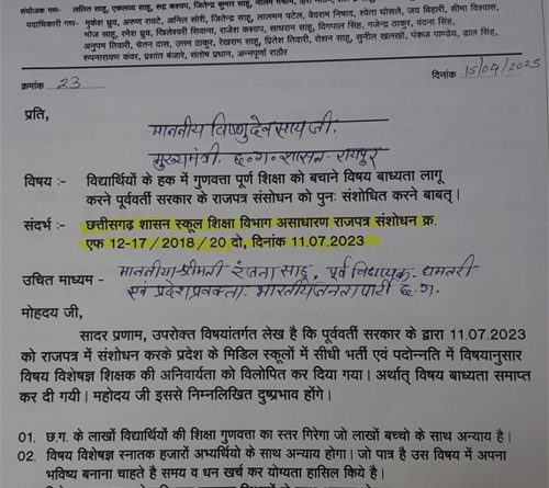 चर्चा के दौरान मंच के पदाधिकारियों ने मंत्री को अवगत कराया कि 2023 के पहले तक छत्तीसगढ़ स्कूल शिक्षा सेवा (शैक्षिक एवम प्रशासनिक संवर्ग) भर्ती तथा पदोन्नति नियम 2019 राजपत्र में प्रकाशन दिनांक 5 मार्च 2019 के अंतर्गत मिडिल स्कूलों में शिक्षक पद पर विषयवार पदोन्नति एवं भर्ती का प्रावधान किया गया था, ताकि मिडिल स्कूलों में विषय विशेषज्ञ शिक्षकों की पदस्थापना हो तथा बच्चों को गुणवत्तापूर्ण शिक्षा प्राप्त हो सके। राष्ट्रीय शिक्षा नीति 2020 में भी विषय विशेषज्ञ शिक्षकों की पदस्थापना का प्रावधान किया गया है।