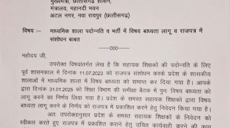 दंतेवाड़ा। प्रदेश मे आधे बच्चे विषय शिक्षकों से पढ़ रहे हैं, जैसे प्राईवेट, आत्मानंद, पीएमश्री, एकलव्य, नवोदय विद्यालय, वहीं सरकारी मिडिल स्कूलों में गैर विषय बाध्यता का गलत नियम यह दोहरा मापदंड शिक्षा गुणवत्ता में चल रहा है। सरकारी स्कूल के बच्चों को भी विषय बंधन का नियम लागू कर शिक्षागुणवत्ता देने के लिए 30 जनवरी को लिए गये निर्णय निर्देश को जल्द लागू करने दंतेवाड़ा विधायक चैतराम अटामी ने मुख्यमंत्री को पत्र लिखा है, ताकि बस्तर जैसे आदिवासी पिछड़े दूरस्थ अंचल के बच्चों को मिडिल स्कूलों में शिक्षा गुणवत्ता और विषय शिक्षक दिया जा सके। नहीं तो ये बच्चे और भी ज्यादा पिछड़ सकते हैं। बस्तर में विषयधारी सहायक शिक्षकों और अभ्यर्थियों की पर्याप्तता है जिन्हें पदोन्नति भर्ती विषयवार देकर इस बड़ी कमी को पूरा किया जा सकता है। विधायक ने जल्द विषय बाध्यता राजपत्र लागू करने की मांग की है।