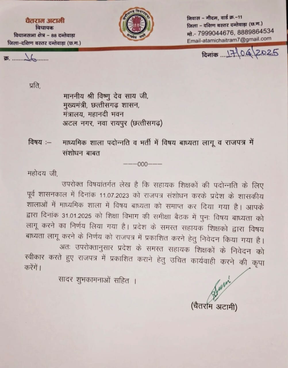 विधायक चैतराम अटामी ने लिखा मुख्यमंत्री को पत्र, विषय बंधन लागू कर शिक्षा गुणवत्ता देने की मांग