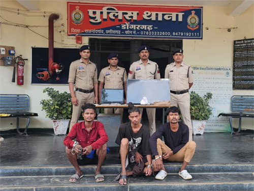 अज्ञात आरोपी के पता-तलाश हेतु घटना स्थल के आसपास के सीसीटीव्ही कैमरा को खंगाला गया। जिस पर संदेही निखिल गोंड़, निवासी-कंडरापारा, बजंरग चौक, डोंगरगढ़, श्याम ठाकुर उर्फ छोटू, निवासी-ग्राम बिच्छीटोला, हाल-बजरंग चौक, डोंगरगढ़ एवं श्रवण मटियारा, निवासी-राम नगर, जेल रोड, वार्ड नंबर २१, डोंगरगढ़ को हिरासत में लेकर पुछताछ किया गया। तीनों प्रार्थी के घर में चोरी करना स्वीकार किये एवं चोरी के समान को आरोपी श्रवण मटियारा के घर में छुपा कर रखना बताये एवं नगदी रकम को खाने-पीने में खर्च कर देना बताये। चोरी के समान को आरोपी श्रवण मटियारा के घर से बरामद किया गया है। तीनों आरोपियों को गिरफ्तार कर माननीय न्यायालय में पेश कर ज्युडि. रिमांड में जेल भेजा गया है।