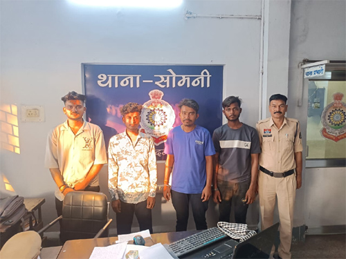 मामले की सूचना वरिष्ठ अधिकारियों को दिया गया। बाद पुलिस अधीक्षक मोहित गर्ग के निर्देशन व अतिरिक्त पुलिस अधीक्षक राहुल देव शर्मा के मार्गदर्शन व नगर पुलिस अधीक्षक पुष्पेन्द्र नायक के पर्यवेक्षण में थाना प्रभारी सोमनी निरीक्षक सत्यनारायण देवांगन के नेतृत्व में थाना सोमनी पुलिस की टीम गठित कर आरोपीगण वेकटेश प्रसाद साहू पिता नैनसुख साहू, उम्र-25 वर्ष, निवासी-ग्राम सुंदरा, आबादीपारा, थाना-सोमनी, गणेश कुमार निषाद पिता राजेन्द्र कुमार निषाद, उम्र-23 वर्ष, निवासी-ग्राम सुंदरा, आबादीपारा, थाना-सोमनी, गुमेश कुमार उइके पिता विक्रम सिंह उईके उम्र-20 वर्ष, निवासी-पोड़िया, थाना-सुरगी, गोपेन्द्र कुमार पिता बलदूराम निषाद, उम्र-21 वर्ष, निवासी-ग्राम सुंदरा, आबादीपारा, थाना-सोमनी को घेराबंदी कर पकडा गया। विधिवत आरोपीगण की गिरफतारी की कार्यवाही कर माननीय न्यायालय में पेश किया गया है।