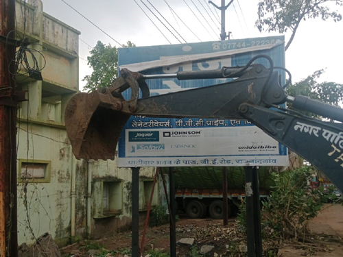 निगम आयुक्त श्री विश्वकर्मा ने बताया कि निगम सीमा क्षेत्रांतर्गत कतिपय विज्ञापन एजेंसियों/संस्थानों/व्यक्तियों द्वारा प्रायः इस निकाय के बिना पूर्वानुमति एवं स्वीकृति के विज्ञापन हेतु बोर्ड/निजी भवनों के दीवाल एवं छत पर होर्डिंग्स बोर्ड/विद्युत पोलों में छोटे बोर्ड, बैनर पोस्टर एवं सार्वजनिक शौचालय/फ्लाई ओव्हर के पिल्हरों में अन्य प्रकार का विज्ञापन लगाया जाता है और कई लोगों द्वारा लगाया भी गया है, जो कि छग विज्ञापन पंजीयन एवं विनियमन उपविधि २०१२ की कंडिका ९ के प्रावधानों का स्पष्ट उल्लंघन है एवं छग नगर पालिक निगम अधिनियम १९५६ की धारा २४८ एवं ४३४ के अंतर्गत दण्डनीय अपराध है। इस संबंध में निरीक्षण के दौरान यातायात बाधित होने वाले बोर्ड एवं अवैध रूप से लगे बोर्ड को हटाने संबंधितों को नोटिस के माध्यम से सूचित करने एवं हटाने होडिंग बोर्ड के प्रभारी अधिकारी अशोक चौबे को निर्देशित किया गया था। किन्तु कतिपय लोगों के द्वारा अवैध होर्डिग्स व बोर्ड नही हटाया गया। जिसे आज निगम की टीम ने कार्यवाही करते हुये जीई रोड में लगे आम्बेडकर चौक से रायपुर नाका तक लगे अवैध विज्ञापन होडिग्स बोर्ड हटाया गया। उक्त कार्यवाही निरंतर जारी रहेगी।
