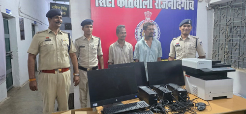 राजनांदगांव। जिले के कर्मचारी राज्य बीमा सेवाएं औषधालय कार्यालय से चोरी गए कंप्यूटर सेट और प्रिंटर मामले में पुलिस ने दो आरोपियों को गिरफ्तार करते हुए बड़ी सफलता हासिल की है। गिरफ्तार आरोपियों के कब्जे से तीन नग नए कंप्यूटर सेट और एक प्रिंटर कुल कीमत 4,83,862 रूपये की सामग्री जब्त की गई है। दोनों आरोपियों को न्यायालय में पेश कर न्यायिक रिमांड पर जेल भेज दिया गया है।