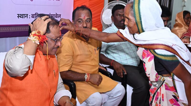 रायपुर। मुख्यमंत्री विष्णु देव साय के गृह ग्राम बगिया स्थित कैंप कार्यालय में रक्षाबंधन के अवसर पर विभिन्न योजनाओं से लाभान्वित बहनों ने राखी बांधकर आभार व्यक्त किया। प्रधानमंत्री आवास योजना, महतारी वंदन योजना की हितग्राही दीदियों के साथ आंगनबाड़ी कार्यकर्ता-सहायिकाएँ, मितानिन और स्व-सहायता समूह की बहनों ने भी मुख्यमंत्री श्री साय की कलाई पर राखी बांधी और उनके दीर्घायु की कामना की।