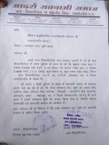 शिकायत में यह भी बताया गया है कि, राजस्व निगम मंडल ऊपरवाह के अंतर्गत जराही पंचायत के अंतर्गत खसरा नंबर 341/1 रकबा 0.5830 एक हेक्टेयर (1.44 एकड़) और खसरा नंबर 341/2 (रकबा 0.4890 हेक्टेयर/1.21 एकड़) कुल खसरा 02 कुल रकबा 2.85 एकड़ ग्राम शिकारी टोला प.ह.नं. 15 रा. नि. मंडल ऊपरवाह तहसील व जिला राजनांदगांव में सतनामी समाज के द्वारा उक्त शमशान घाट में पिछली तीन पीढ़ियों से शव का अंतिम संस्कार करते आ रहे हैं। वहां अंशद सिंह के द्वारा प्रशासन और ग्रामीणों को अंधेरे में रखते हुए गुपचुप तरीके से बेजा कब्जा कर लिया गया है। जिसको लेकर समस्त ग्रामवासी और सतनामी समाज में आक्रोश व्याप्त है। सतनामी समाज ने एसडीएम से उक्त शमशान घाट की भूमि को अवैध कब्जे से मुक्त करते हुएए सतनामी समाज को सौंपने की मांग की है।