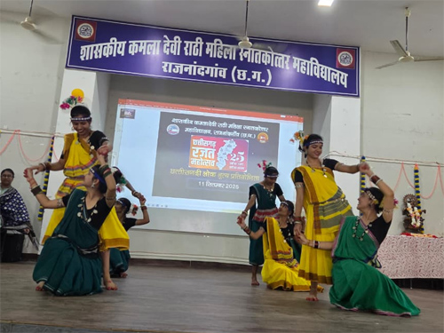 राजनांदगांव। छत्तीसगढ़ राज्य के गठन की रजत जयंती वर्ष के उपलक्ष्य में शासकीय कमला देवी राठी महिला स्नातकोत्तर महाविद्यालय, राजनांदगांव में दिनांक 11 सितम्बर 2025 को प्राचार्य डा. ओंकार लाल श्रीवास्तव के मार्गदर्शन में छत्तीसगढ़ी लोक नृत्य प्रतियोगिता का भव्य आयोजन किया गया। आयोजन शासन के निर्देशानुसार रजत जयंती उत्सव 2025 के अंतर्गत किया गया, जिसमें महाविद्यालय की छात्राओं ने पारंपरिक छत्तीसगढ़ी लोक संस्कृति की मनमोहक झलक प्रस्तुत की।
