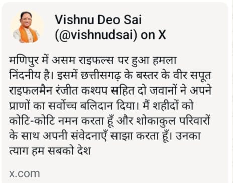 रायपुर। मुख्यमंत्री श्री विष्णुदेव साय ने मणिपुर में असम राइफल्स पर हुए कायरतापूर्ण हमले की कड़े शब्दों में निंदा की है। इस हमले में छत्तीसगढ़ के बस्तर के वीर सपूत राइफलमैन रंजीत कश्यप सहित दो जवानों ने अपने प्राणों का सर्वोच्च बलिदान दिया।