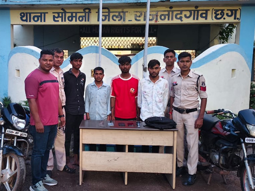 राजनांदगांव। सोमनी थाना क्षेत्र में एक युवक से लूट की वारदात को अंजाम देने वाले चार आरोपियों को पुलिस ने गिरफ्तार कर लिया है। पुलिस ने आरोपियों के कब्जे से लूट के दो मोबाइल फोन, चांदी की चेन, घड़ी, साथ ही घटना में प्रयुक्त दो मोटरसाइकिल और दो धारदार चाकू भी जब्त किए हैं।