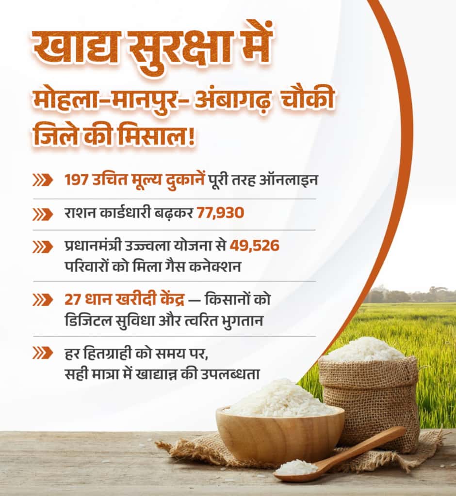 डिजिटल तकनीक और सेवा भावना के इस संगम से मोहला-मानपुर-अंबागढ़ चौकी जिला न केवल खाद्य सुरक्षा में आत्मनिर्भर हो रहा है, बल्कि छत्तीसगढ़ की विकास यात्रा में नई पहचान के साथ आगे बढ़ रहा है।