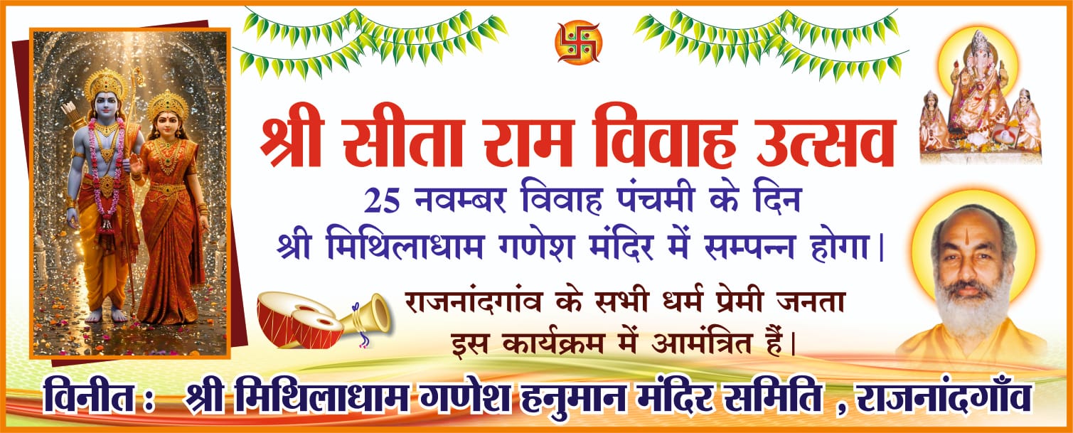 राजनांदगांव। श्री मिथिला धाम गणेश हनुमान मंदिर में अगहन शुक्ल पंचमी यानी विवाह पंचमी पर इस वर्ष भव्य राम–जानकी विवाह उत्सव मनाया जाएगा। इस पावन अवसर पर मां जानकी का त्रेतायुग में श्री रामजी के साथ हुआ विवाह श्रद्धालुओं के साथ विधिवत रूप से पूज्य मोनी बाबा के संरक्षण और आशीर्वाद में मंदिर परिसर में आयोजित किया जाएगा।