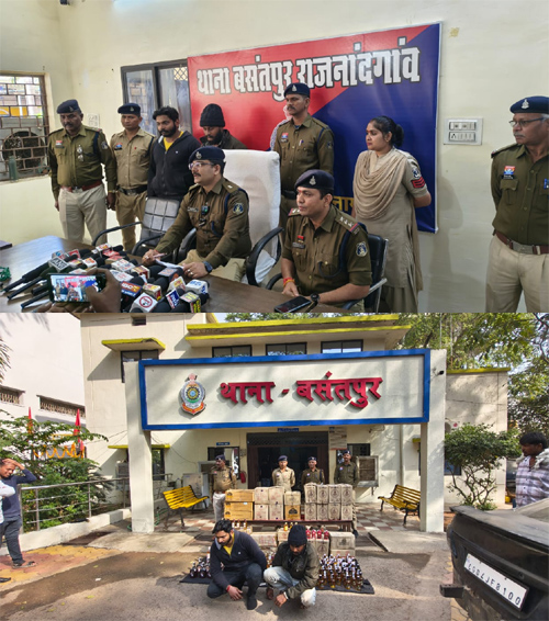 राजनांदगांव। थाना बसंतपुर पुलिस ने शनिवार देर रात अवैध शराब तस्करी के खिलाफ बड़ी सफलता हासिल करते हुए भारी मात्रा में अंग्रेजी व देशी शराब सहित कार व मोबाइल जब्त किए हैं। कार्रवाई पुलिस अधीक्षक सुश्री अंकिता शर्मा के निर्देशन तथा अतिरिक्त पुलिस अधीक्षक राहुल देव शर्मा, नगर पुलिस अधीक्षक श्रीमती वैशाली जैन एवं पुष्पेंद्र नायक के मार्गदर्शन में की गई। थाना प्रभारी निरीक्षक एमन साहू के नेतृत्व में पुलिस टीम लगातार अवैध शराब, गांजा एवं नशीले पदार्थों के विरुद्ध अभियान चला रही है।