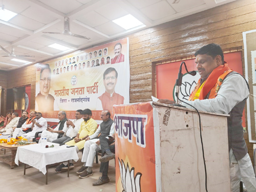 राजनांदगांव। भारतीय जनता पार्टी के जिला पदाधिकारी, जिला पंचायत एवं जनपद निगम अध्यक्षों की आवश्यक बैठक आज आयोजित की गई। बैठक के मुख्य अतिथि प्रभारी मंत्री गजेंद्र यादव और अध्यक्षता संगठन प्रभारी एवं दुर्ग भाजपा जिला अध्यक्ष जितेंद्र वर्मा ने की।