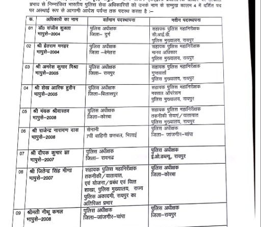 नौकरशाह December 26, 2018 नेशन अलर्ट शेयर करें... 1,631 11 एसपी सहित 17 आईपीएस बदले गए ! राजधानी रायपुर पहली बार महिला पुलिस अधिकारी के हाथों में ! नक्सल प्रभावित जिले से मैदानी इलाकों में भेजे गए पुलिस अफसर ! ( सूची देखिए )