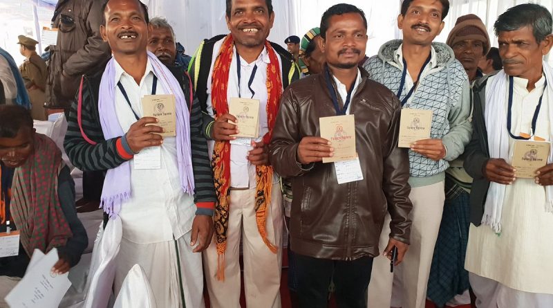रायपुर में आज गणतंत्र दिवस पर आयोजित मुख्य समारोह में बस्तर के लोहंडीगुड़ा क्षेत्र के किसान प्रसन्नचित्त नजर आए. दरअसल इन किसानों को भू अधिकार पुस्तिका (किसान किताब) का वितरण किया गया. सीएम भूपेश बघेल ने क्षेत्र के 23 किसानों को किसान किताब पुस्तिका सौंपी. उल्लेखनीय है कि लोहंडीगुुड़ा क्षेत्र में इस्पात संयंत्र लगाने के नाम पर किसानों की भूमि अधिग्रहित कर ली गई थी. कांग्रेस की सरकार बनने के बाद यह जमीन वापस किसानों को दे दी गई है.