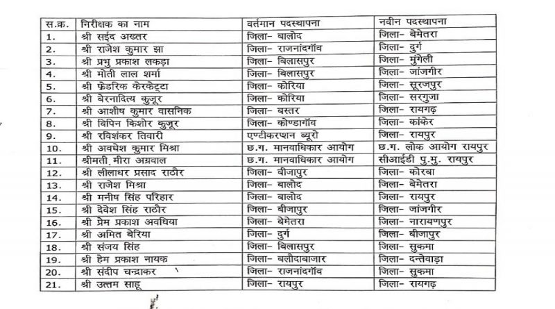 बहरहाल, सईद अख्तर को बालोद से बेमेतरा भेजा गया है। राजेश कुमार झा को राजनांदगांव से दुर्ग भेजा गया है।प्रभु प्रकाश लकड़ा को बिलासपुर से मुंगेली भेजा गया है।