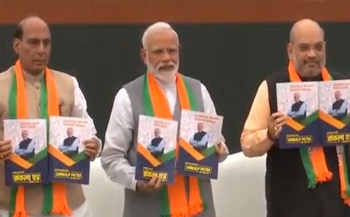 लोकसभा चुनाव के मद्देनजर भाजपा ने अपना संकल्प पत्र आज नई दिल्ली में जारी किया. प्रधानमंत्री नरेंद्र मोदी, राष्ट्रीय अध्यक्ष अमित शाह की मौजूदगी में गृहमंत्री राजनाथ सिंह द्वारा प्रस्तुत किया गया संकल्प पत्र 48 पन्नों का है. इसमें सुरक्षा के साथ किसी तरह का समझौता नहीं किया जाएगा, अवैध घुसपैठ पूरी तरह से रोकी जाएगी, राम मंदिर के लिए सभी प्रकार की संभावनाएं तलाशी जाएगी, साठ साल की उम्र के बाद किसानों को पेंशन सुविधा दी जाएगी, 2022 तक किसानों की आय दुगुनी होगी, किसान क्रेडिट कार्ड से एक लाख रूपए तक का कर्ज ब्याजमुक्त रहेगा, छोटे दुकानदारों को भी पेंशन दी जाएगी, राष्ट्रीय व्यापार आयोग का गठन होगा, देशभर में एक साथ चुनाव कराने की कोशिश होगी, प्रत्येक परिवार के लिए पक्का मकान उपलब्ध कराया जाएगा जैसी घोषणाएं की गई है. जम्मू कश्मीर से धारा 35ए हटाने की कोशिश सहित यूनिफार्म सिविल कोर्ड लागू करने,राममंदिर निर्माण जैसी पुरानी योजनाओं को दोहराया गया है.
