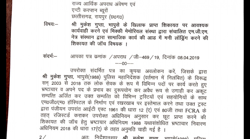 छत्तीसगढ़ के स्पेशल डीजी मुकेश गुप्ता के खिलाफ कार्यवाहियों का सिलसिला लगातार जारी है. अब राज्य सरकार ने उनके एमजीएम आई हॉस्पिटल की जांच के आदेश कर दिए हैं. गृह विभाग के अवर सचिव डीपी कौशल ने आदेश करते हुए ईओडब्ल्यू को प्रकरण को सौंप दिया है. दरअसल 2003 से 2018 के दौरान लोकसेवक रहते हुए आईपीएस मुकेश गुप्ता ने भ्रष्टाचार कर अवैध रूप से उगाही गई अकूत संपत्ति को ट्रस्ट के नाम से एमजीएम अस्पताल में लगा दिया था. इस आशय का पत्र सरकार को मिला था. अब गृह विभाग ने आईपीएस गुप्ता से जुड़े एमजीएम हॉस्पिटल की जांच के लिए लिखा है. मनी लांड्रिंग के मामले में अब ईओडब्ल्यू जांच करेगा.