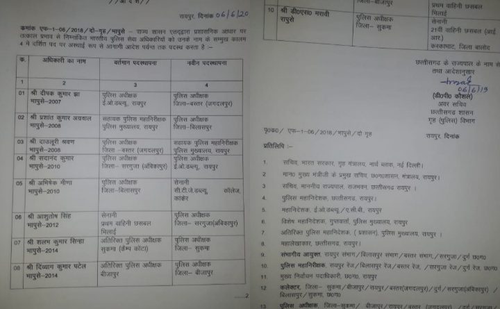 आशुतोष सिंह एसपी सरगुजा,शलभ सिन्हा एसपी सुकमा,दिव्याँग पटेल एसपी बीजापुर,गोवर्धन राम ठाकुर सेनानी प्रथम वाहिनी भिलाई,डीएस मरावी सेनानी बालोद बनाए गए हैं.