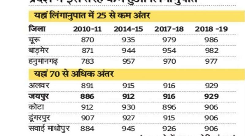 अकेले सिरोही जिले में प्रतिहजार बेटों के पीछे 11 बेटियां कम पैदा हुई है. टोंक में 36, अजमेर में 13, गंगानगर में 8, भरतपुर में 3 बेटियां कम पैदा हुई है. कोटा में नौ साल की मेहनत के बाद लिंगानुपात में छ: अंकों की वृद्धि देखी गई है.