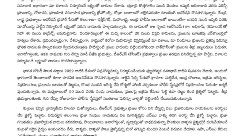 तेलंगाना के नक्सली संगठनों ने वहां के मुख्यमंत्री केसीआर यानिकि के चंद्रशेखर राव पर आरोप लगाए हैं. उन्होंने कहा है कि 15 जुलाई को भद्रादी कोत्तागुड़म जिला मनवुर मंडल के गोलापल्ली व कोमरमभीमा सीफावाद जिला तीरयानी मंडल में मंगी प्रांत के तोकागुडा के जंगल में पुलिस द्वारा की गई कार्रवाई में बहुत सा नुकसान हुआ है.