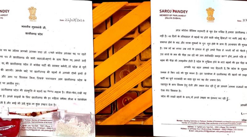 सरोज पांडेय ने मुख्यमंत्री को लिखा है कि “इस रक्षाबंधन पर छत्तीसगढ़ की बहनों को उपहार स्वरूप वे पूर्ण शराबबंदी की सौगात देंगे. रक्षासूत्र के साथ तिलक के लिए रोली और अक्षत भेज रही हूं जो आपको आपका राजधर्म याद दिलाता रहेगा, ऐसा मेरा विश्वास है”.