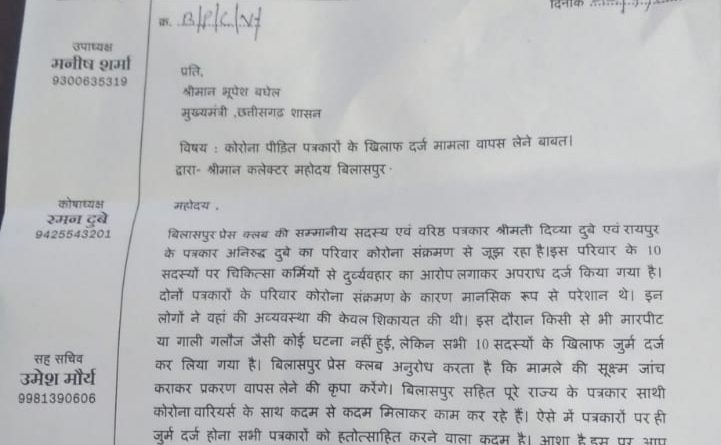 इस पर बिना किसी जांच के आननफानन में एफआईआर दर्ज हो गई. मामले में प्रेस क्लब अध्यक्ष तिलक राज सलूजा और सचिव वीरेंद्र गहवई की टीम ने मुख्यमंत्री भूपेश बघेल के नाम कलेक्टर को ज्ञापन सौपा है.